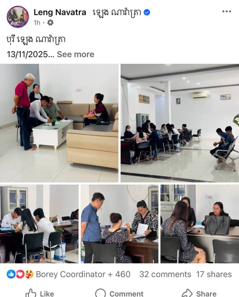 ជាក់ស្តែងកាលពីថ្ងៃទី១៣ ខែវិច្ឆិកា ដែលត្រូវបានបង្ហោះលើបណ្តាញសង្គមផ្លូវការរបស់អ្នកឧកញ៉ា ឡេង ណាវ៉ាត្រា នៅថ្ងៃសុក្រនេះបានបង្ហាញរូបភាពជាច្រើនសន្លឹកភ្ជាប់ជាមួយខ្លឹមសារបញ្ជាក់ពីសកម្មភាពអតិថិជនមួយចំនួនបានបន្តមកពិភាក្សាស្វែងរកដំណោះស្រាយ និងបញ្ចប់ដោយស្នាមញញឹមនឹងឈ្នះឈ្នះទាំងអស់គ្នា ដោយបុរីប្រកាន់ជំហរឈរលើកគោលការណ៍ដោះស្រាយ មិនឲ្យអតិថិជនខាតបង់អត្ថប្រយោជន៍ឡើយ។
