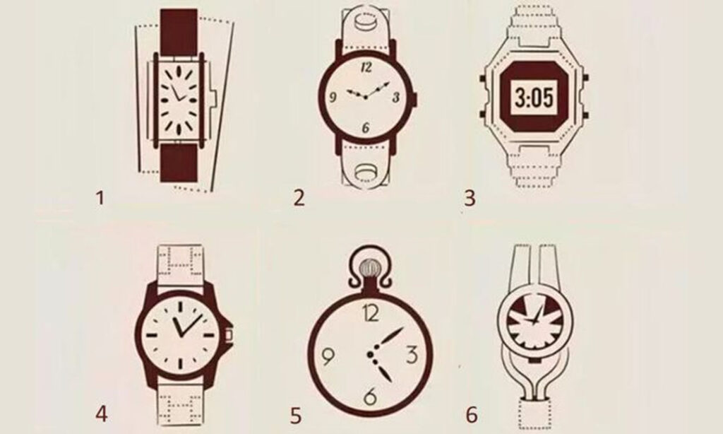 ការធ្វើតេស្តបុគ្គលិកលក្ខណៈនេះ បង្ហាញពីទិដ្ឋភាពលាក់កំបាំងមួយទៀតរបស់អ្នក។ សូមជ្រើសរើសពីនាឡិកាមួយដែលលោកអ្នកពេញចិត្ត នៅក្នុងចំណោមទាំងប្រាំមួយគ្រឿងនេះ តើមួយណាទាក់ទាញភ្នែកជាងគេ?