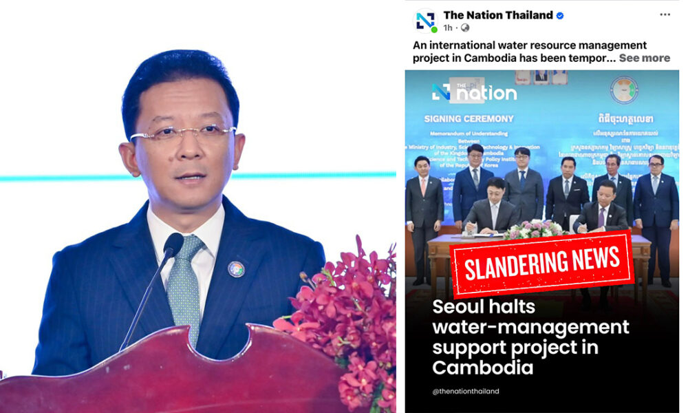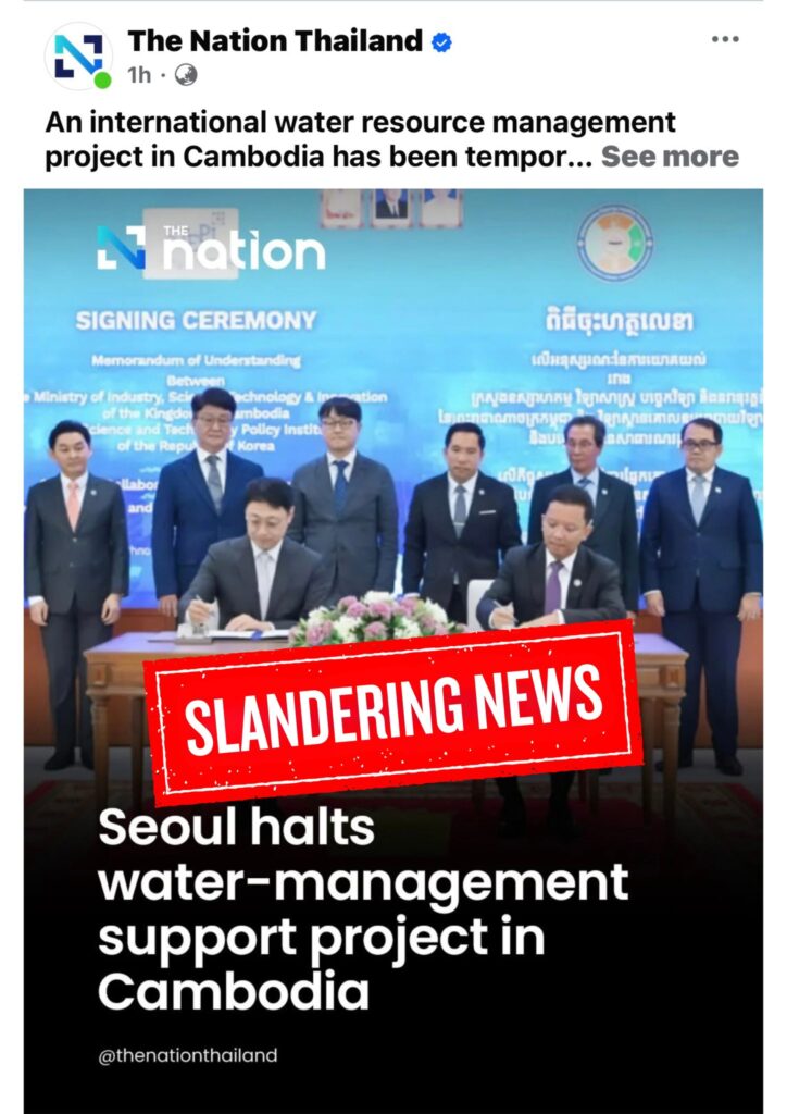 ក្រសួងឧស្សាហកម្ម បច្ចេកវិទ្យា និងនវានុវត្តន៍បានច្រានចោលចំពោះអត្ថបទព័ត៌មាន ដែលចេញផ្សាយមានចរិតបំភាន់ មូលបង្កាច់ និងគ្មានវិជ្ជាជីវៈ ដោយសារព័ត៌មានថៃ The Nation Thailand កាលពីថ្ងៃទី១៩ ខែតុលា ឆ្នាំ២០២៥ ដែលថា “សាធារណៈរដ្ឋកូរ៉េផ្អាកគម្រោងគាំទ្រវិស័យ គ្រប់គ្រងទឹកនៅកម្ពុជា ឬ Seoul halts water-management support project in Cambodia” ដោយភ្ជាប់រូបថត នៃពិធីចុះហត្ថលេខាលើអនុស្សរណៈរវាងក្រសួងឧស្សាហកម្ម វិទ្យាសាស្ត្រ បច្ចេកវិទ្យា និងនវានុវត្តន៍ (ក្រសួងឧ .វ.ប.ន.) និងវិទ្យាស្ថានគោលនយោបាយវិទ្យាសាស្ត្រ និងបច្ចេកវិទ្យារបស់កូរ៉េខាងត្បូង (STEPI)។