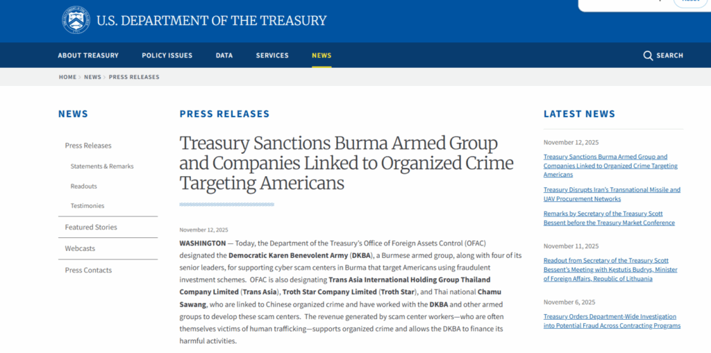 សេចក្ដីថ្លែងការណ៍របសក្រសួងបាននិយាយយ៉ាងដូច្នេះថា៖ «សហរដ្ឋអាមេរិកបានដាក់ទណ្ឌកម្មលើបុគ្គលចំនួន ៥ នាក់ និងអង្គភាពចំនួន ៣ ដែលមានទីតាំងនៅភូមា និងថៃ ចំំពោះការជាប់ពាក់ព័ន្ធរបស់ពួកគេទៅនឹងមជ្ឈមណ្ឌលបង្ខំកម្លាំងពលកម្ម ដែលធ្វើប្រតិបត្តិការបោកប្រាស់វិនិយោគតាមអ៊ិនធឺរណិត»។