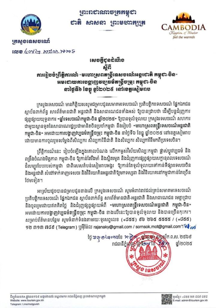 ក្រសួងទេសចរណ៍ សហការជាមួយស្ថានទូតចិនប្រចាំកម្ពុជា នឹងរៀបចំព្រឹត្តិការណ៍ «មហោស្រពតន្ត្រីទេសចរណ៍អន្តរជាតិ កម្ពុជា-ចិន» អមដោយការបង្ហាញវប្បធម៌តន្ត្រីចម្រុះ កម្ពុជា-ចិន នៅថ្ងៃទី៦ ខែធ្នូ ឆ្នាំ២០២៥ នៅខេត្តសៀមរាប ដោយមានការចូលរួមសម្តែងពីសិល្បករ សិល្បការិនីជាតិ និងសិល្បករ សិល្បការិនីមកពីប្រទេសចិន។