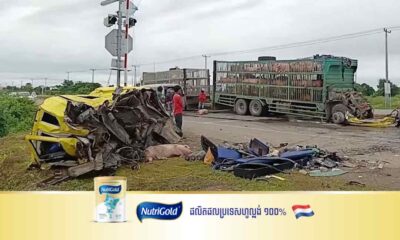 រថយន្តដឹកជ្រូក បោះពួយបុករថភ្លើង រងរបួសធ្ងន់ ៤ នាក់ នៅស្រុកសង្កែ...