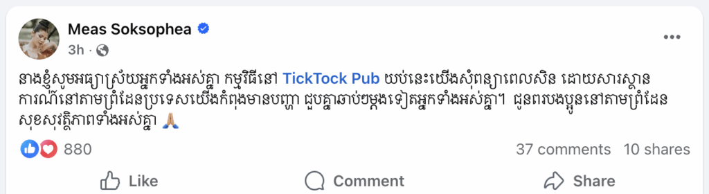តារាចម្រៀង មាស សុខសោភា បានលើកឡើងថា “នាងខ្ញុំសូមអធ្យាស្រ័យអ្នកទាំងអស់គ្នាកម្មវិធីនៅ Tick Tock Pub យប់នេះយើងសុំពន្យាពេលសិន ដោយសារស្ថានការណ៍នៅតាមព្រំដែនប្រទេសយើងកំពុងមានបញ្ហាជួបគ្នាឆាប់ៗម្ដងទៀត អ្នកទាំងអស់គ្នា”។ ទន្ទឹមនេះ អ្នកនាងក៏បានជូនពរដល់ពលរដ្ឋខ្មែរនៅតាមព្រំដែន មានសុខសុវត្ថិភាពទាំងអស់គ្នា។