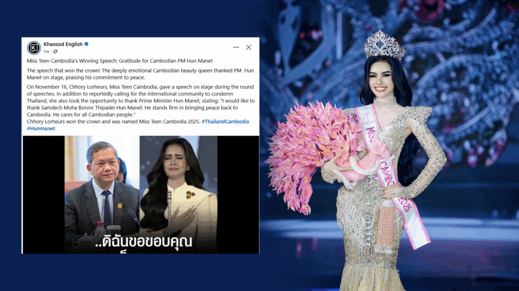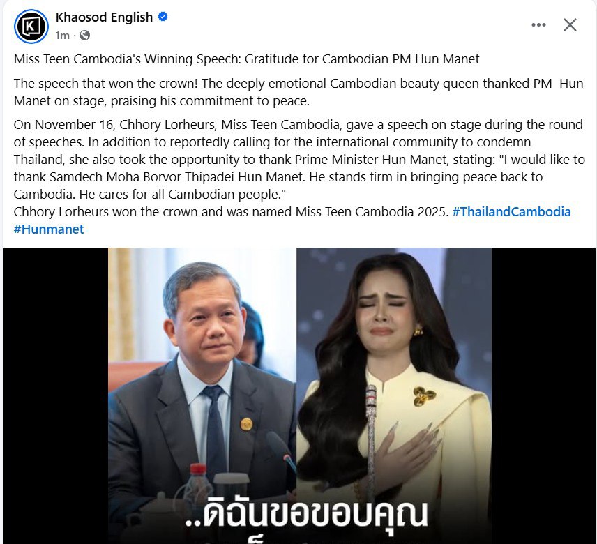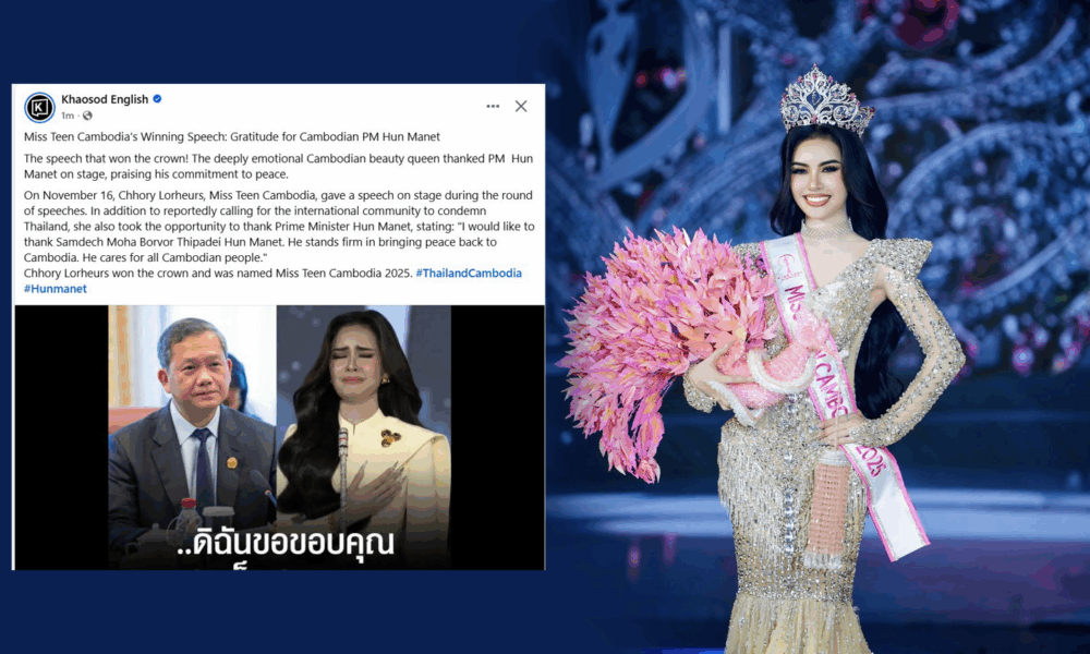 យ៉ាងណា ក្នុងខ្លឹមសារដែលបានផ្សាយ Khaosod មិនត្រឹមតែរំលេចនូវពាក្យពេចន៍ដ៏រំជួលចិត្តរបស់បវរកញ្ញាវ័យក្មេងកម្ពុជារូបនេះទេ តែក៏សង្កត់ធ្ងន់ផងដែរលើការអំពាវនាវរបស់ម្ចាស់មកុដ Miss Teen Cambodia 2025 ដែលបានសុំឱ្យសហគមន៍អន្តរជាតិថ្កោលទោសប្រទេសថៃ ជាហេតុ ធ្វើឱ្យអ្នកជ្រុលនិយមថៃបង្ហាញការខឹងសម្បារ និងឡកលើយកម្ពុជាជាថ្មី។