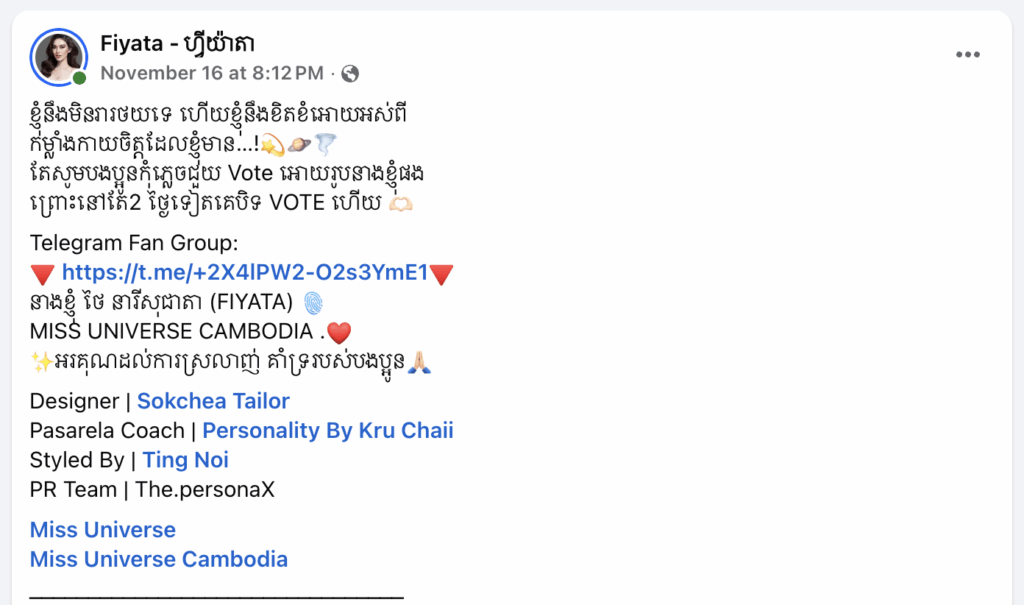 ម្ចាស់មកុដ Miss Universe Cambodia 2025 អ្នកនាង ថៃ នារីសុជាតាហៅ ហ្វីយ៉ាតាដែលតំណាងឲ្យកម្ពុជាចូលរួមប្រកួតលើឆាកអន្តរជាតិបានស្នើដោយទទូចដល់អ្នកគាំទ្រនិងអ្នកស្នេហាវិស័យបវកញ្ញានៅកម្ពុជាត្រូវរួមដៃគ្នាបោះឆ្នោតបើចង់ឲ្យQueenកម្ពុជាចូលTopជ្រៅដើម្បីឲ្យអន្តរជាតិបានស្គាល់យើងកាន់តែច្បាស់៕ អត្ថបទ : ចាន់រ៉ា