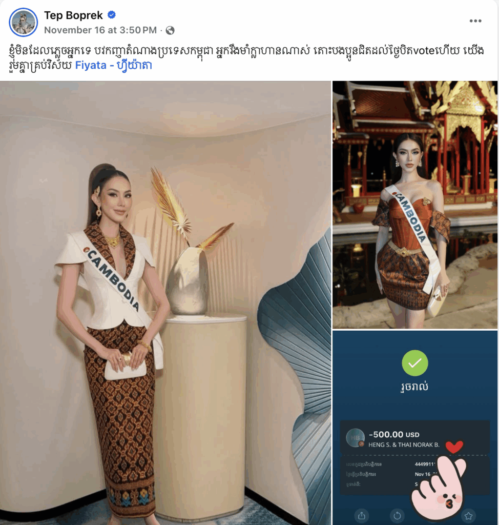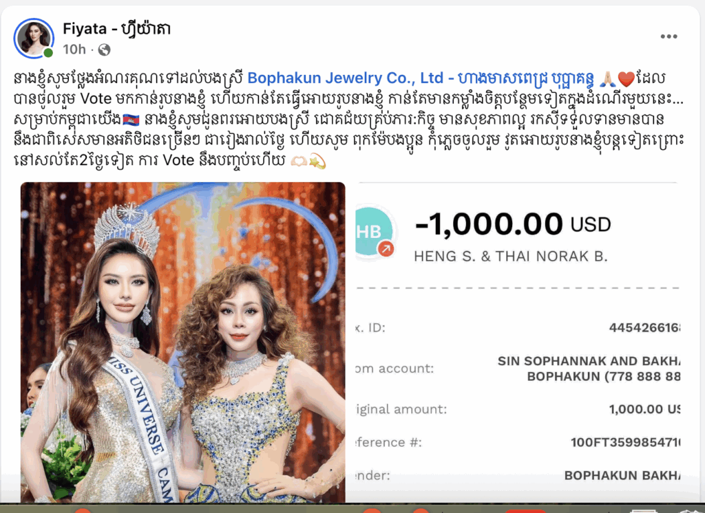 តារាចម្រៀង ទេព បូព្រឹក្ស បានអំពាវនាវទៅកាន់អ្នកគាំទ្រ ពិសេសអ្នកនិយមតាមដានវិស័យបវរកញ្ញាថា “មិនដែលភ្លេចអ្នកទេ បវរកញ្ញាតំណាងប្រទេសកម្ពុជា អ្នករឹងមាំក្លាហានណាស់ តោះបងប្អូនជិតដល់ថ្ងៃបិតvoteហើយ យើងរួមគ្នាគ្រ ប់វិស័យ Fiyata – ហ្វីយ៉ាតា។