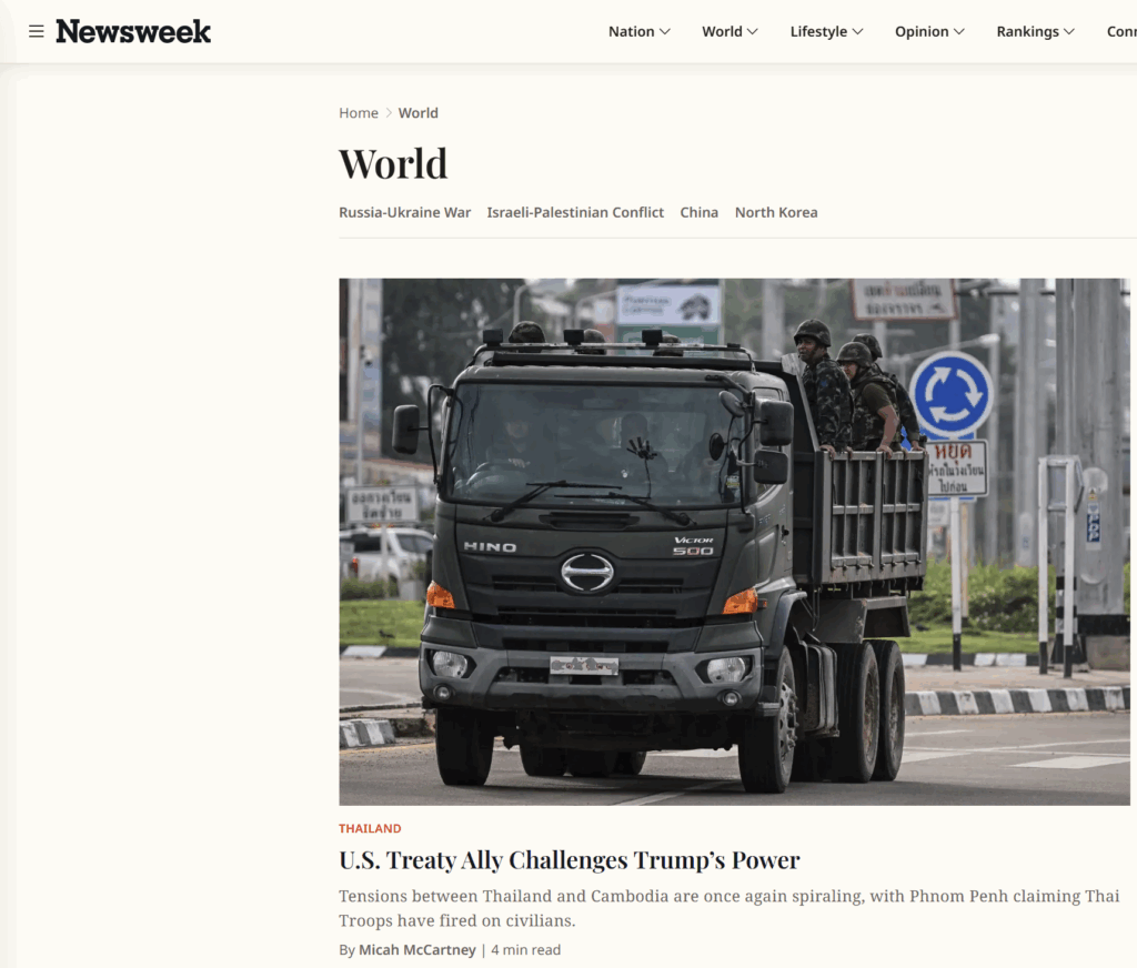 ស្របពេលនាយករដ្ឋមន្ត្រីថៃ អនុទីន ឆាន់វីរៈគុល គំរាមឈប់រកស៊ីជាមួយសហរដ្ឋអាមេរិក ប្រសិនបើ លោក ដូណាល់ ត្រាំ ដំឡើងពន្ធដើម្បីដាក់សម្ពាធក្រោយទីក្រុងបាងកក ប្រកាសផ្អាកកិច្ចព្រមព្រៀងសន្តិភាពជាមួយកម្ពុជា ដែលមានប្រមុខសេតវិមាននិងប្រធានអាស៊ានឆ្នាំ២០២៥ ធ្វើជាសាក្សីនោះ ស្រាប់តែសារព័ត៌មានដ៏ល្បីឈ្មោះអាមេរិក Newsweek បានចេញផ្សាយអត្ថបទមួយ ដោយដាក់ចំណងជើងធំៗថា សម្ព័ន្ធមិត្តសន្ធិសញ្ញារបស់សហរដ្ឋអាមេរិក កំពុងសាកល្បងអំណាចរបស់លោក ត្រាំ។