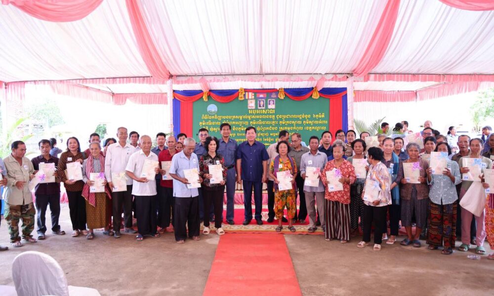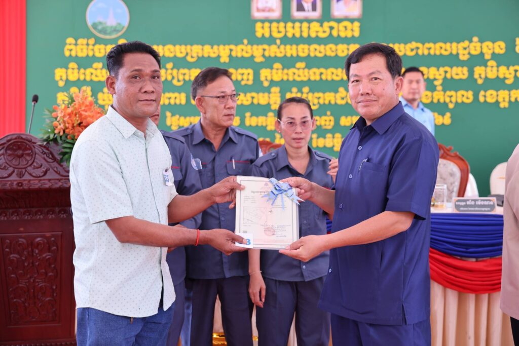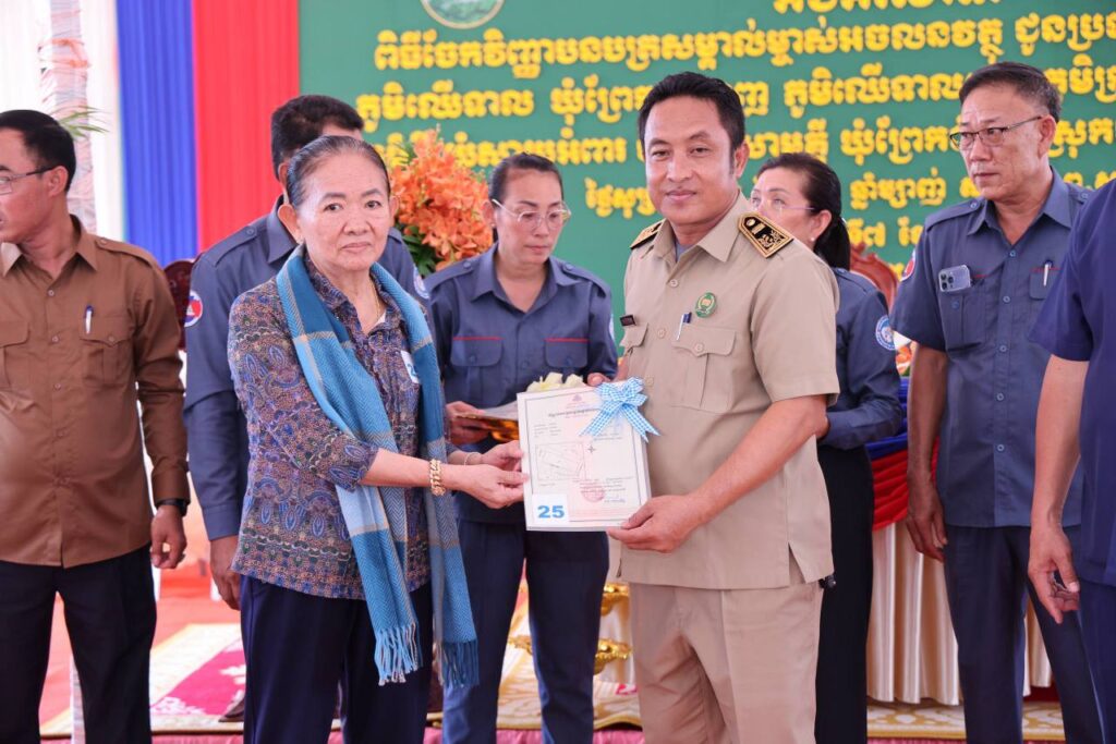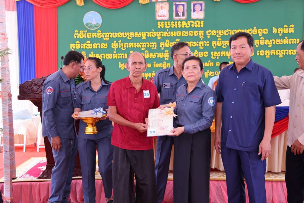 ពិធីចែកប័ណ្ណកម្មសិទ្ធិដីធ្លីនេះ ធ្វើឡើងក្រោមអធិបតីភាព លោក ចយ សុបិន សមាជិកក្រុមប្រឹក្សាខេត្ត និងលោក តាំង ម៉េងលាន អភិបាលរងខេត្តកណ្ដាល ដោយមានការអញ្ជើញចូលរួមពីសំណាក់អាជ្ញាធរស្រុកមុខកំពូល មន្ទីរជុំវិញខេត្ត និងប្រជាពលរដ្ឋជាច្រើនរូប។