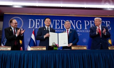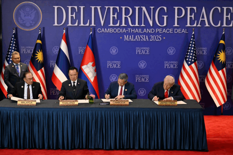 កម្ពុជានិងថៃបានឈានដល់ការចុះហត្ថលេខាលើសេចក្ដីថ្លែងការណ៍រួមសន្តិភាពកាលពីថ្ងៃទី២៦ ខែតុលា ឆ្នាំ២០២៥ ដោយមានប្រធានាធិបតីអាមេរិកលោក ដូណាល់ត្រាំ និងនាយករដ្ឋមន្ត្រីម៉ាឡេស៊ីលោក អាន់វ៉ា អ៊ីប្រាហ៊ីម ជាសាក្សី។ ទោះជាយ៉ាងណាក្រោយហេតុការណ៍ទាហានថៃដើរចូលចម្ការមីនជិតប្រាសាទព្រះវិហារជាន់មីនដាច់ជើងមកកាលពីថ្ងៃទី១០ ខែវិច្ឆិកា នាយករដ្ឋមន្ត្រីថៃលោក អានុទីន ចាន់វីរៈគុល បានប្រកាសផ្អាកការអនុវត្តន៍កិច្ចព្រមព្រៀងនេះដោយមិនត្រូវការជម្រាបអ្នកណាទាំងអស់សូម្បីតែអាមេរិក លោកក៏បានបោះសំដីបន្ថែមផងដែរសូមកុំឱ្យអាមេរិកគំរាមរឿងពន្ធលើថៃករណីបញ្ហាព្រំដែនជាមួយកម្ពុជាឱ្យសោះព្រោះថៃនឹងរកទីផ្សារថ្មីមកជំនួសវិញ។