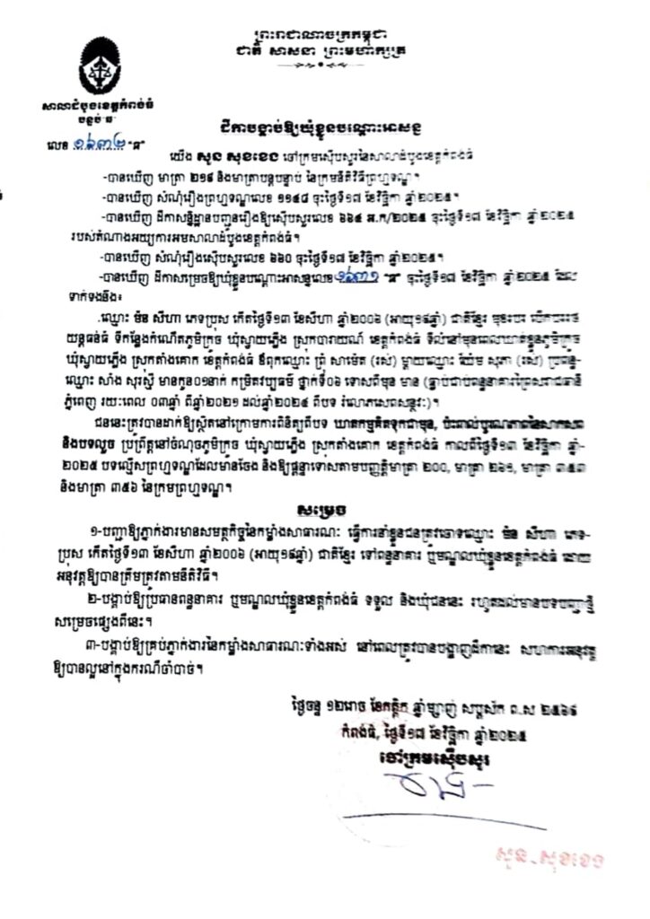 លោក សួន សុខខេង ចៅក្រមស៊ើបសួរនៃសាលាដំបូងខេត្តកំពង់ធំ កាលពីថ្ងៃទី១៧ ខែវិច្ឆិកា ឆ្នាំ២០២៥ បានសម្រេចចេញដីកាបង្គាប់ឲ្យឃុំខ្លួនជនសង្ស័យឈ្មោះ ម៉ន សីហា ដាក់ពន្ធនាគារបណ្ដោះអាសន្ន ក្រោមបទចោទប្រកាន់ ឃាតកម្មគិតទុកជាមុន ប៉ះពាល់បូរណភាពនៃសាកសព និងបទលួច បទល្មើសព្រហ្មទណ្ឌដែលមានចែង និងឱ្យផ្តន្ទាទោសតាមបញ្ញត្តិមាត្រា ២០០, មាត្រា ២៦១, មាត្រា ៣៤៣ និងមាត្រា ៣៥៦ នៃក្រមព្រហ្មទណ្ឌ។