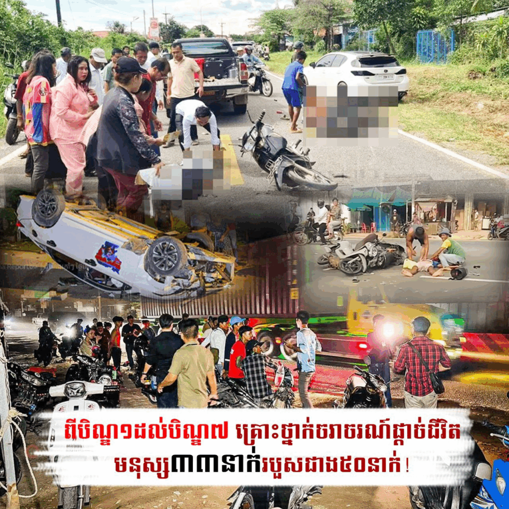 ក្នុងរយៈពេល៧ថ្ងៃ គិតចាប់តាំងពីថ្ងៃទី៨ ដល់ទី១៤ ខែកញ្ញា ឆ្នាំ២០២៥ ក្នុងឱកាសបុណ្យកាន់បិណ្ឌទី១ ដល់បិណ្ឌទី៧ នៅទូទាំងប្រទេសកម្ពុជាមានគ្រោះថ្នាក់ចរាចរណ៍ បន្តកើតឡើងសរុបចំនួន៤៥ករណី បណ្តាលឱ្យមានមនុស្សស្លាប់៣៣នាក់ និងរងរបួសធ្ងន់ស្រាលចំនួន៥៤នាក់។ នេះបើតាមលោក ទូច សុឃៈ អ្នកនាំពាក្យរងក្រសួងមហាផ្ទៃ។