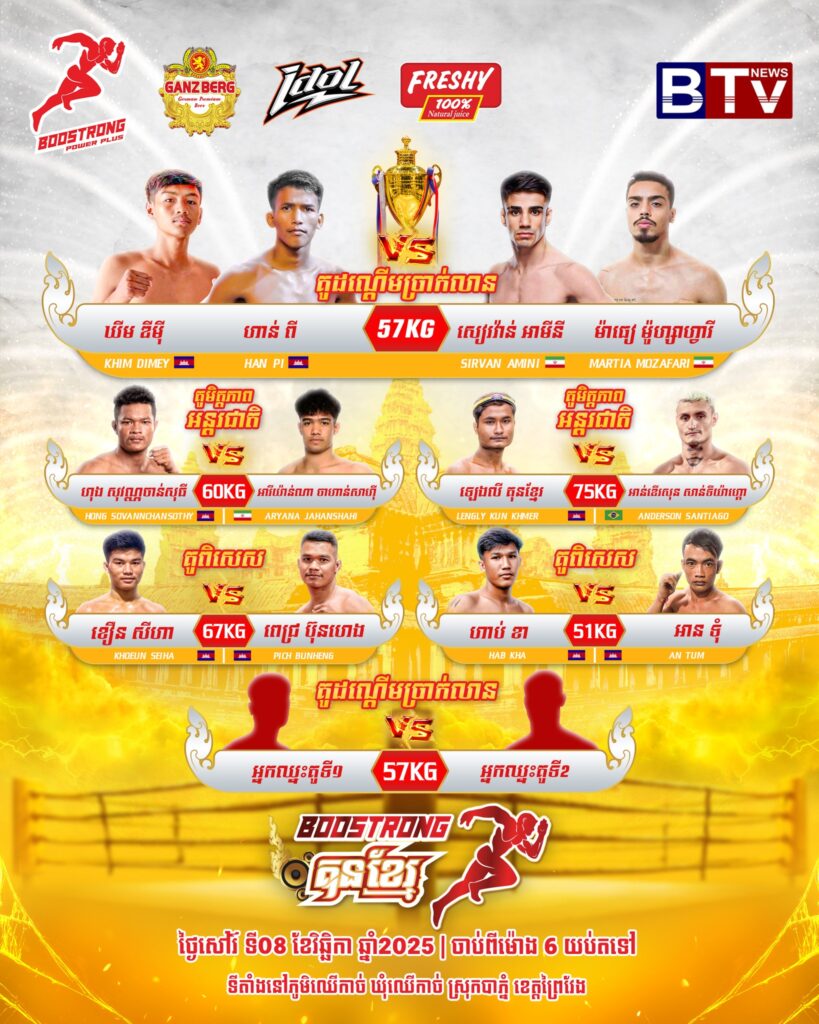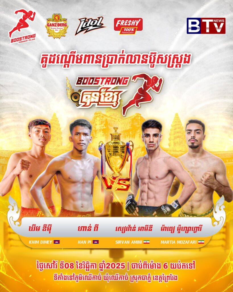 បញ្ជាក់ដែរថា ការប្រកួតម៉ារ៉ាតុងដណ្ដើមពានរង្វាន់ខាងលើនេះរៀបចំឡើងដោយសង្វៀន BTV ដែលគ្រោងធ្វើឡើងនៅឯភូមិឈើកាច់ ឃុំឈើកាច់ ស្រុកបាភ្នំ ខេត្តព្រៃវែង។ ការប្រកួតនេះនឹងចាប់ផ្ដើមឡើងពីម៉ោង ៦ល្ងាចថ្ងៃទី៨ ខែវិច្ឆិកា ឆ្នាំ២០២៥។ ចូលរួមទស្សនាគាំទ្រការប្រកួតទាំងអស់គ្នាដើម្បីលើកទឹកចិត្តកីឡាករគុនខ្មែរ៕