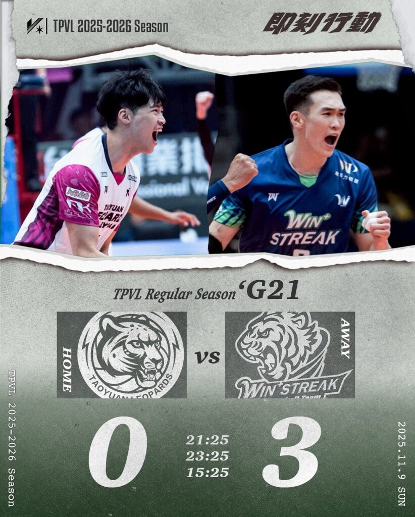 កាលពីថ្ងៃ សៅរិ៍ ទី ០៨ ខែ វិច្ឆិកា ឆ្នាំ ២០២៥ ក្រុមបាល់ទះ Win Streak បានយកឈ្នះលើក្រុម Taipei East Power ក្នុងលទ្ធផល ៣ សិតទល់ ១។ បន្ទាប់មកនៅថ្ងៃ អាទិត្យ ទី ០៩ ខែ វិច្ឆិកា ពួកគេបានបន្តយកឈ្នះលើក្រុម Taoyuan Cloud Leopard ក្នុងលទ្ធផល ៣ សិតទល់ ០។
