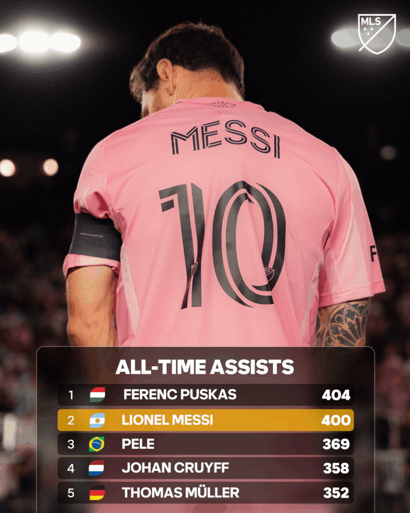 ខ្សែប្រយុទ្ធរបស់ក្រុម Inter Miami កីឡាករ Lionel Messi ត្រូវការការបញ្ជូនឱ្យមិត្តរួមក្រុមស៊ុតបញ្ចូលទីត្រឹមតែ ៥ លើកទៀតប៉ុណ្ណោះ នឹងបំបែកកំណត់ត្រាក្លាយជាស្តេចបញ្ជូនបាល់ (assists) ក្នុងប្រវត្តិសាស្ត្របាល់ទាត់។