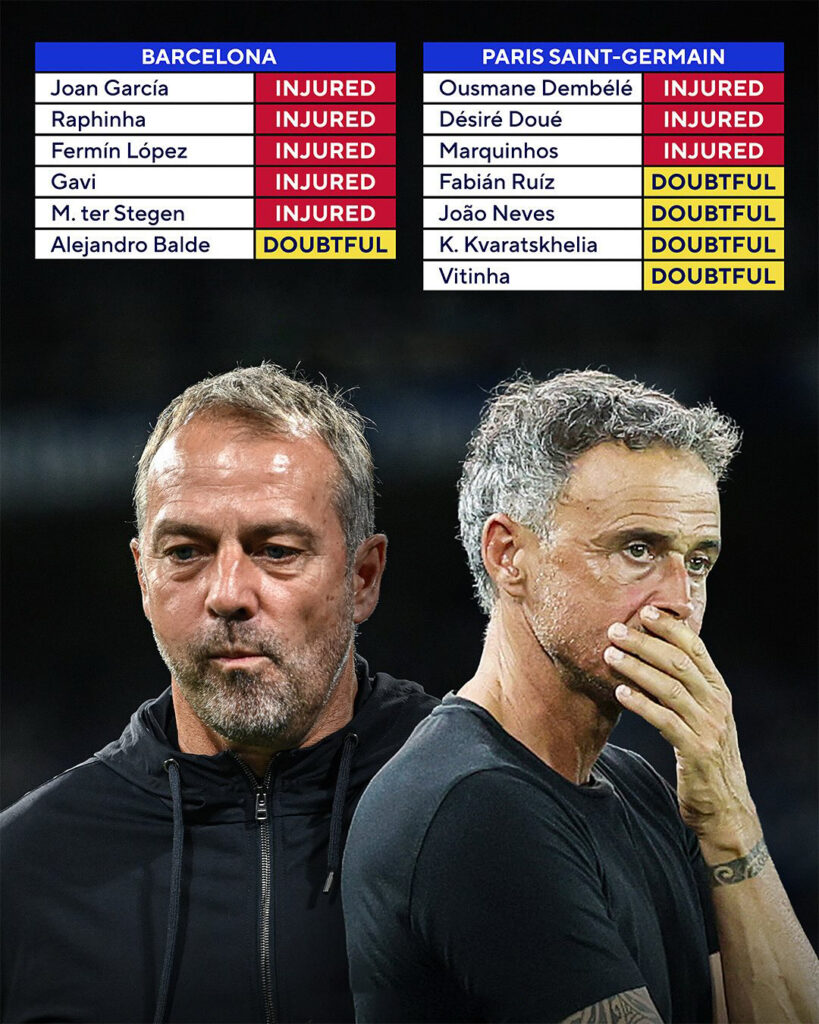 ទាំង Barcelona និង Paris Saint-Germain សុទ្ធតែមានក្តីព្រួយបារម្ភ ចំពោះបញ្ហាកីឡាករសំខាន់របួសដូចគ្នា មុនការប្រកួតរវាងក្រុមទាំង ២ ក្នុងពាន Champions League ក្នុងវគ្គសន្សំពិន្ទុ League Phase នៅថ្ងៃទី ២ ខែ តុលា ឆ្នាំ ២០២៥ ឆាប់ៗនេះ។