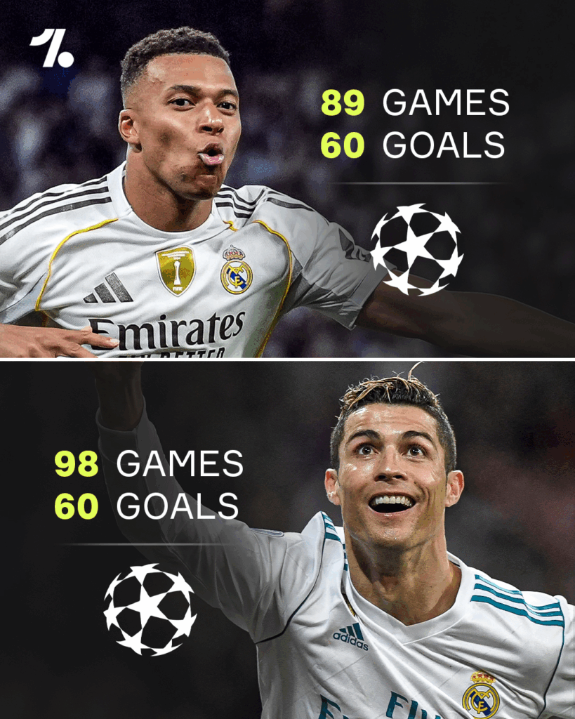 Mbappe បានចំណាយពេលសរុបចំនួន ៨៩ ប្រកួត តាមរយៈការលេងជាមួយ Monaco, Paris Saint-Germain និង Real Madrid ដើម្បីអាចរកបានគ្រាប់បាល់ទី ៦០ ក្នុងពានរង្វាន់ទ្វីបអឺរ៉ុប UCL ។ យ៉ាងណា បើមើលទៅលើស្ថិតិនេះ គឺ Mbappe ធ្វើបានកំណត់ត្រាល្អជាងវីរបុរស Real Madrid កីឡាករ Cristiano Ronaldo ដែលជានិមិត្តរូបរបស់ខ្លួនទៅទៀត។